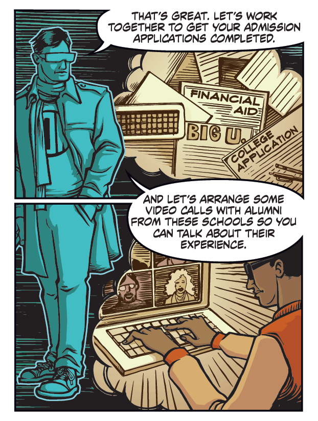 The documents we reviewed from Massachusetts Pre-ETS services or other states were boring, ugly, complex, and read like a legal document. For parents, the documents were difficult to understand, and I could not imagine a teenager, one who was just informed they were losing their sight, comprehending these documents. However, it was clear that the documentation did not speak to their audience in a way that was positive and engaging. They were not written or designed with the customer in mind. The audience for the materials is young. For this project, my team chose to tell the story of visually impaired teens and Massachusetts Pre-ETS services in the form of a graphic novel.